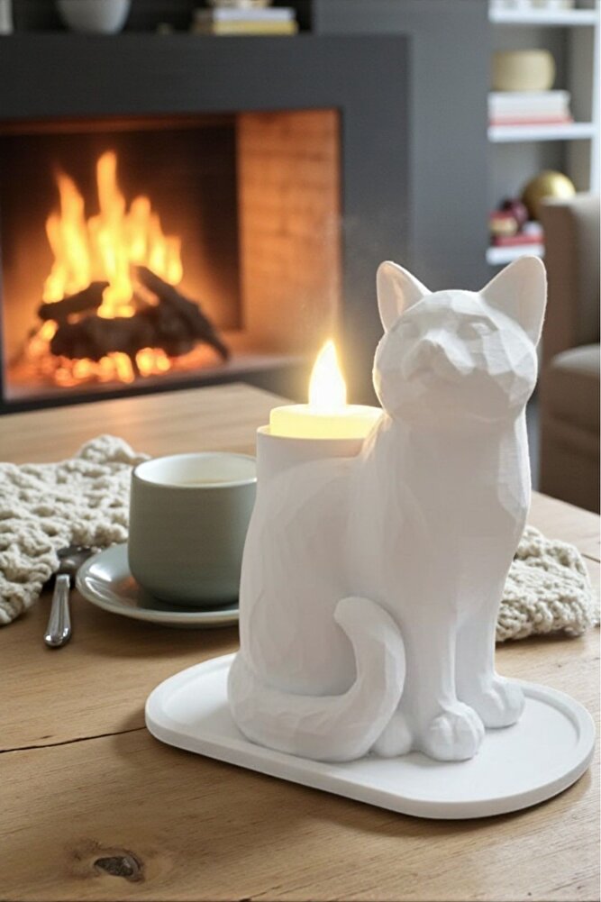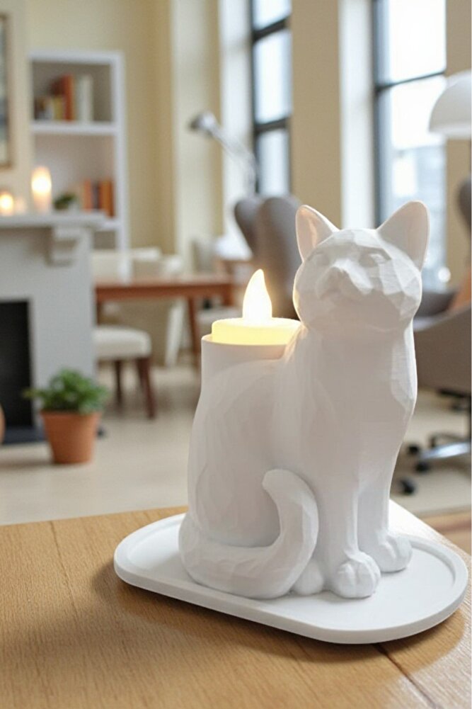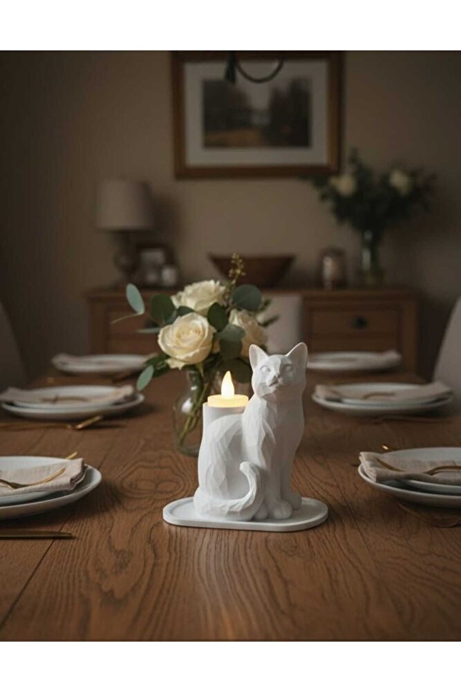 Beyaz Mozaik Dekoratif Kedi Biblo Led Mumlu Şık Ev Ofis Masa Üstü Aksesuar Mumluk (led Mum Hediye)