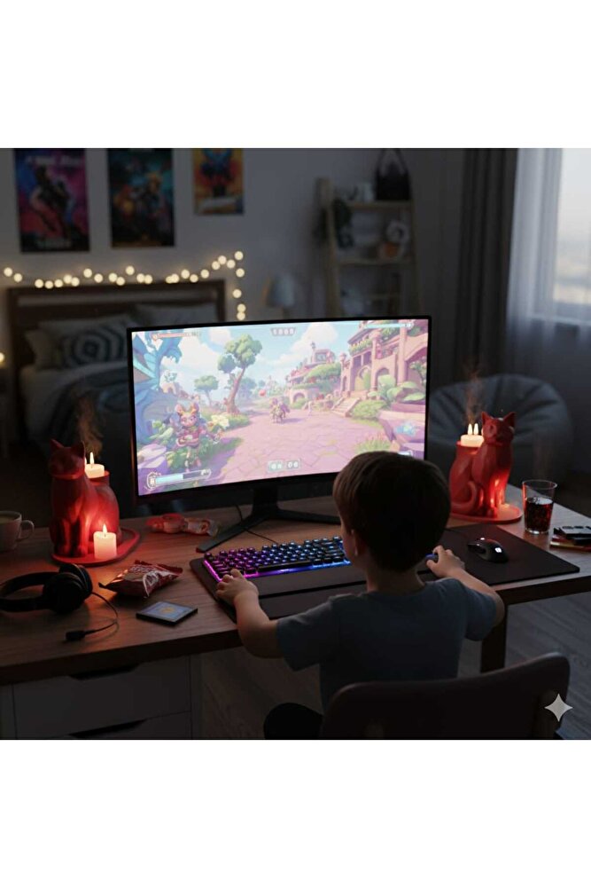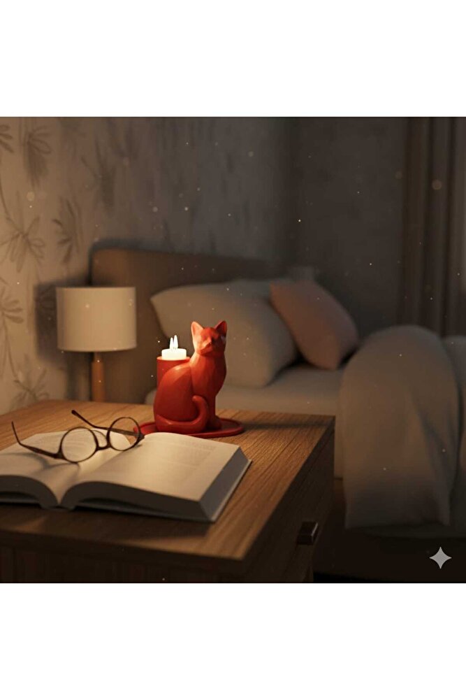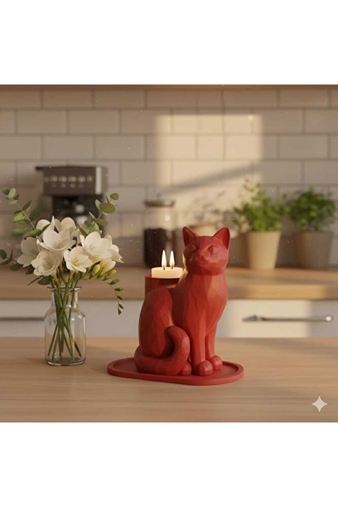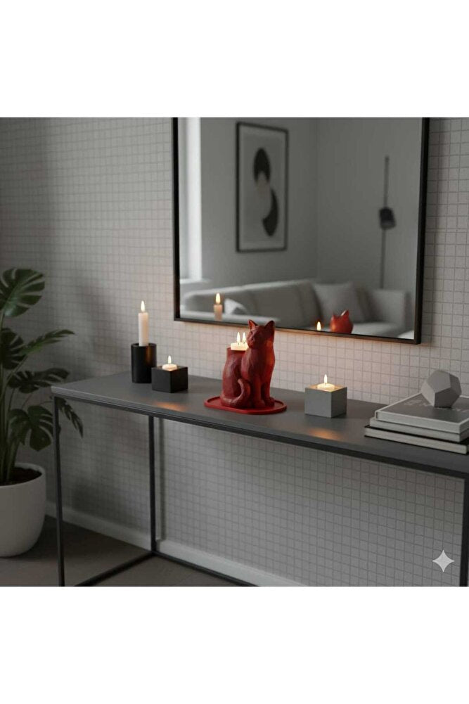 Kırmızı Mozaik Dekoratif Kedi Biblo Led Mumlu Şık Ev Ofis Masa Üstü Aksesuar Mumluk (led Mum Hediye)