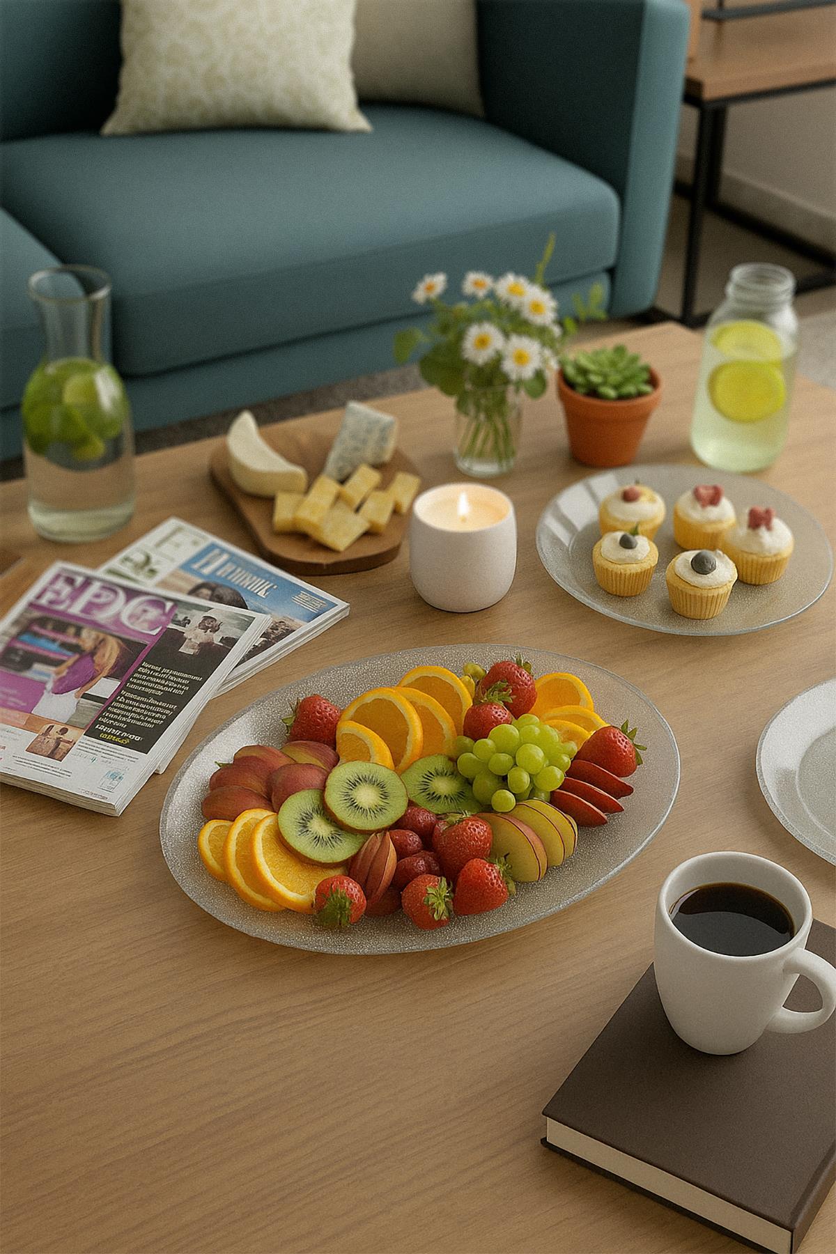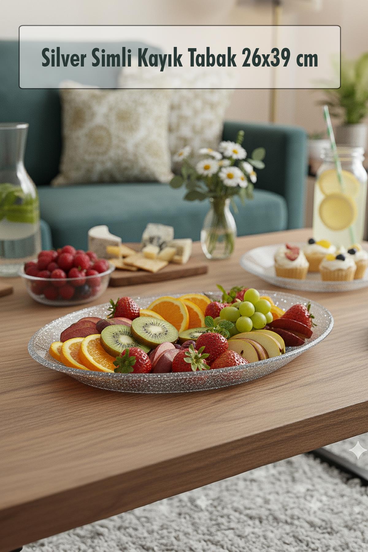 Silver simli ışıltılı tasarımıyla sofralarınıza zarafet katan bu büyük kayık tabak, meyve, tatlı veya kahvaltılık ikramlar için şık bir sunum deneyimi sunar. Şeffaf akrilik yapısı sayesinde hem dayanıklı hem de estetik bir görünüm sağlar.