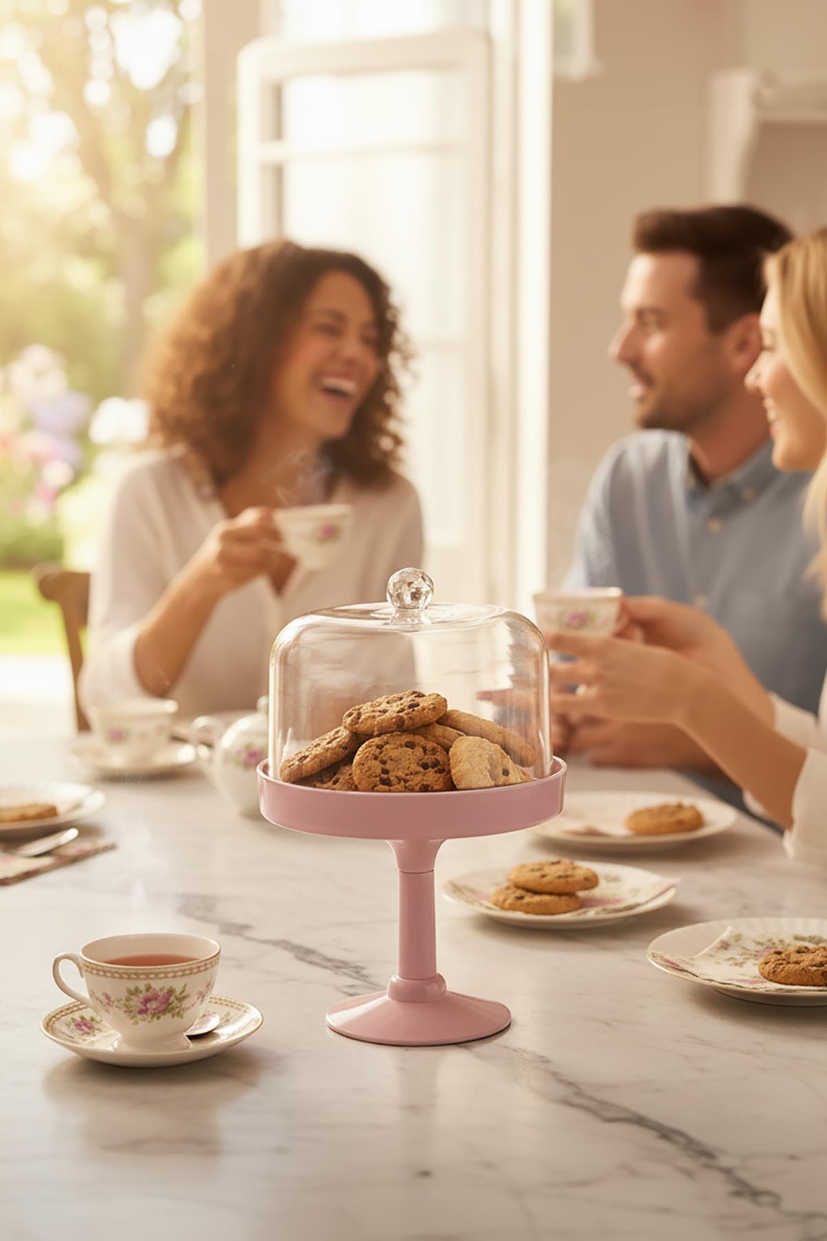 Soft pembe tonuyla sofralarınıza zarif bir dokunuş katan bu ayaklı kurabiyelik, çay saatlerine estetik bir şıklık kazandırır. Şeffaf kapağı sayesinde ikramlarınız tazeliğini korur ve her ortamda dikkat çeker.
